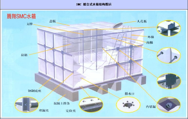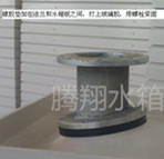 玻璃鋼水箱第二步:接下來就要放上法蘭了,注意螺栓方向是根據螺桿從水箱內部往外穿的,向外穿螺桿時先帶平墊后帶兩層膠墊(水箱專用的膠條),穿出螺桿后這時添加水箱板與法蘭之間的法蘭橡膠墊,板與膠墊之間打上玻璃膠,接下來螺桿上套法蘭緊固螺母,(緊固螺母時用力不能過猛,用力均勻,使法蘭安裝在水箱板上牢靠為目的)。示意圖如下:
